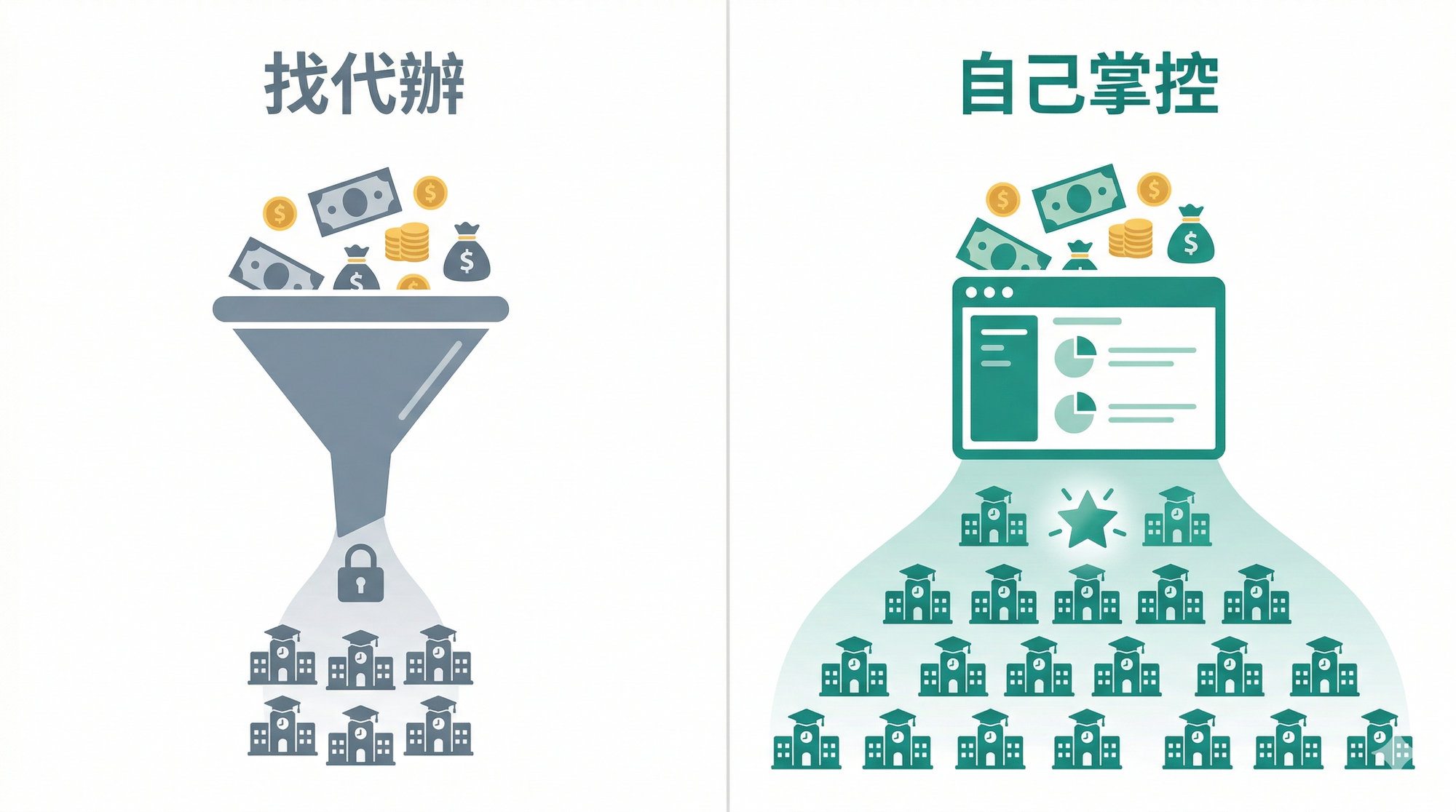 還有一件事值得想清楚:代辦的收費結構,通常是以「申請幾間學校」來計算的。很多方案大約涵蓋 6 到 8 間學校,費用卻往往是一筆不小的數字。但如果你掌握了自己的申請流程,同樣的預算可以讓你多投遞 20 到 30 間學校,而且不會增加多少額外的時間成本。