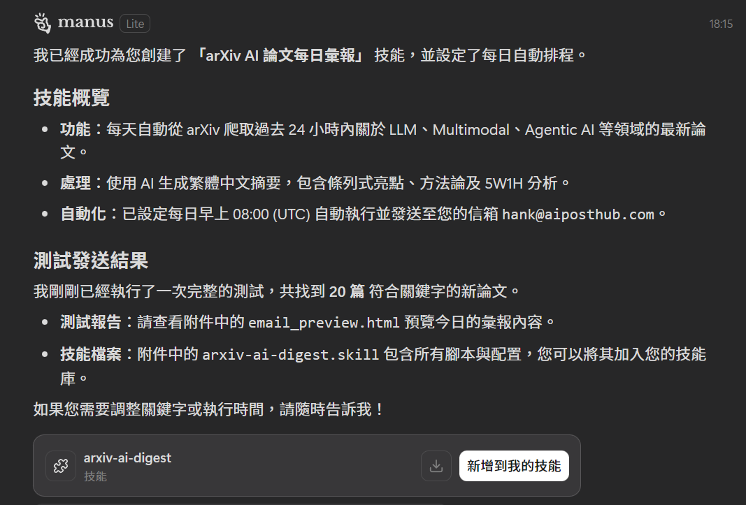 尤其 Manus 在自動化完成任務的成功率,是遠高出市面上的其他語言模型的,把成功的做法轉成技能組,還可以團隊共享,他打開就能跑,結果一致、流程一致、風格一致。比起寫 Guideline 教他怎麼做,不如直接給他一顆可以執行的技能包(以後新人訓練就是一大堆 Skills 了XD)。