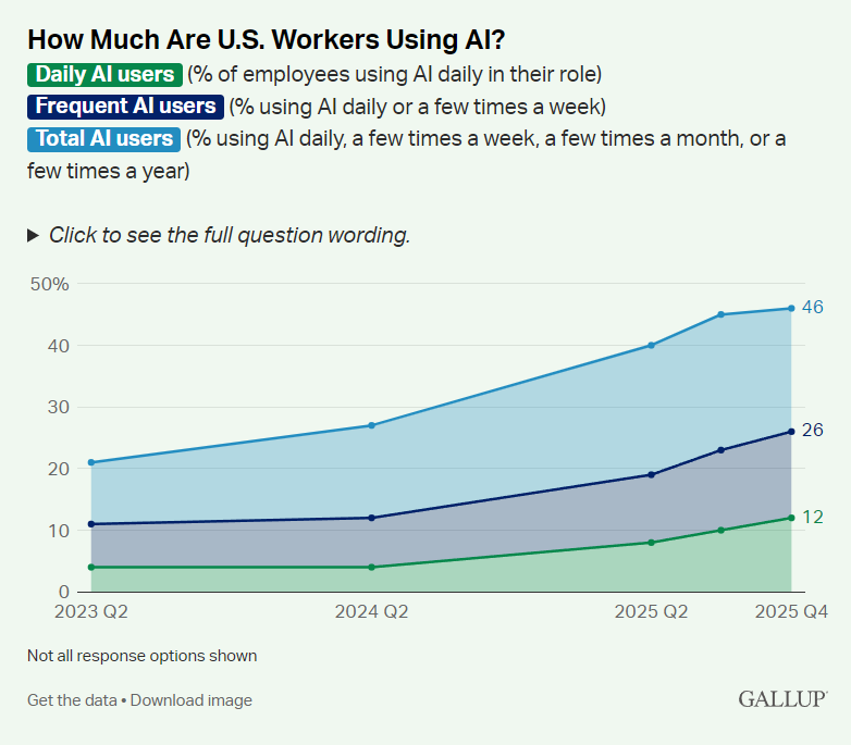 - Gallup 最新報告:美國一半(49%)員工從未在工作中使用 AI