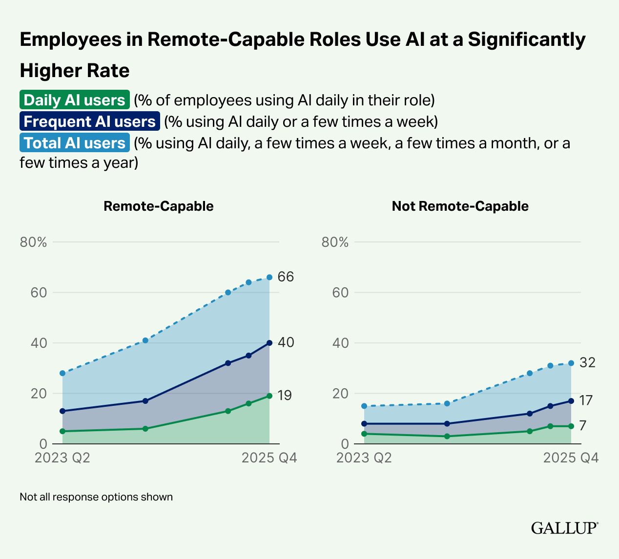 根據 Gallup 調查,科技行業員工是最早也是最頻繁使用 AI 的群體,60% 的科技工作者表示經常使用 AI。與此同時,領導者使用 AI 的比例遠高於一般員工,69% 的領導者表示至少每年會使用 AI 工具,這一比例顯著高於員工中的 40%。此外,遠程工作的職位也顯示出更高的 AI 採用率,其中 66% 的遠程工作者使用 AI,相較於 需要實體工作地點的員工僅有 32%。