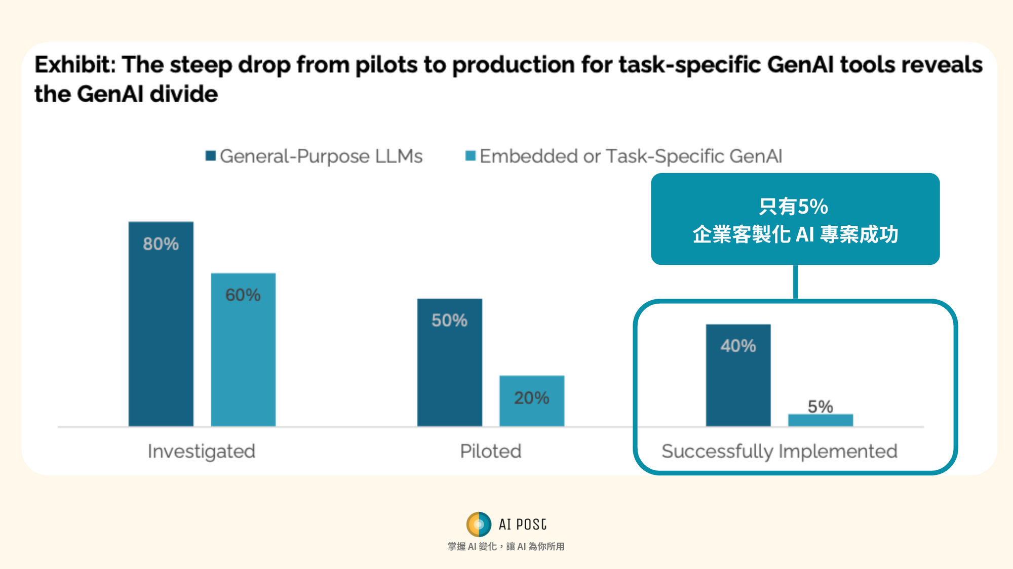 - 95% 的企業客製化 AI 專案失敗,原因包括「過度工程化」「與流程不符」「實際業務無法落地」。