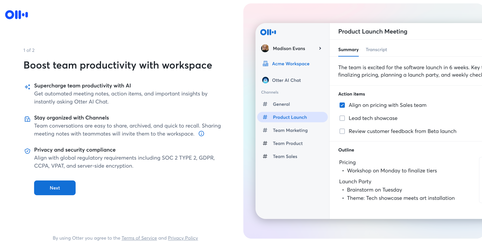 - 會議中:Otter.ai 自動加入會議並即時轉錄,生成逐字稿、摘要與行動項目。