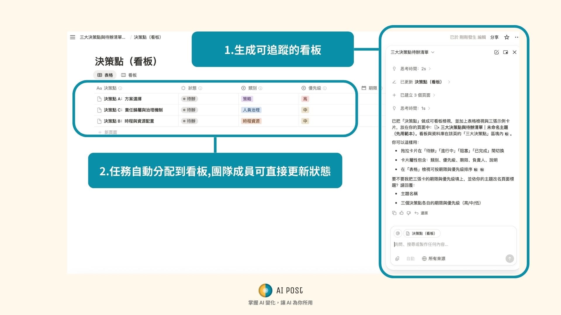 - 智慧轉換:啟用 Notion AI,輸入指令,例如「請整理三大決策並建立待辦清單」,即可立即生成可追蹤的任務。