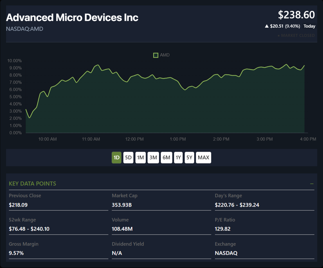 10 月 15 日,AMD 股票上漲 9.4%,收盤 238.60 美元,遠超 S&P 500(+0.4%)和 Nasdaq(+0.6%)。