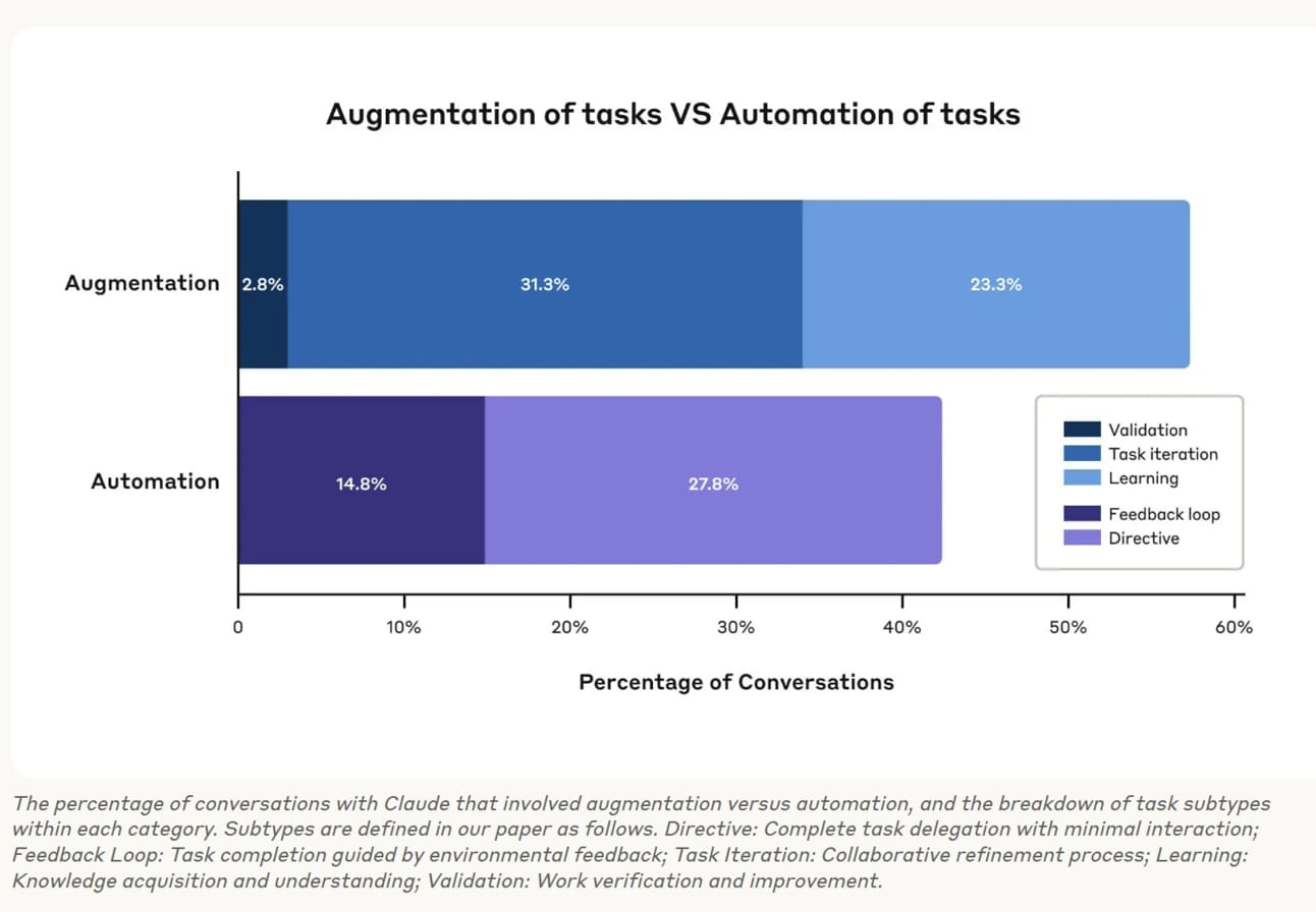 此外,這個指標還會根據使用方式給予不同權重——「自動化(automated)」場景獲得完整權重,而「輔助型(augmentative)」場景僅計半數權重 。這讓測量結果更能反映「AI 真正在取代人類做事」的程度,而非只是「AI 在旁邊幫忙」。