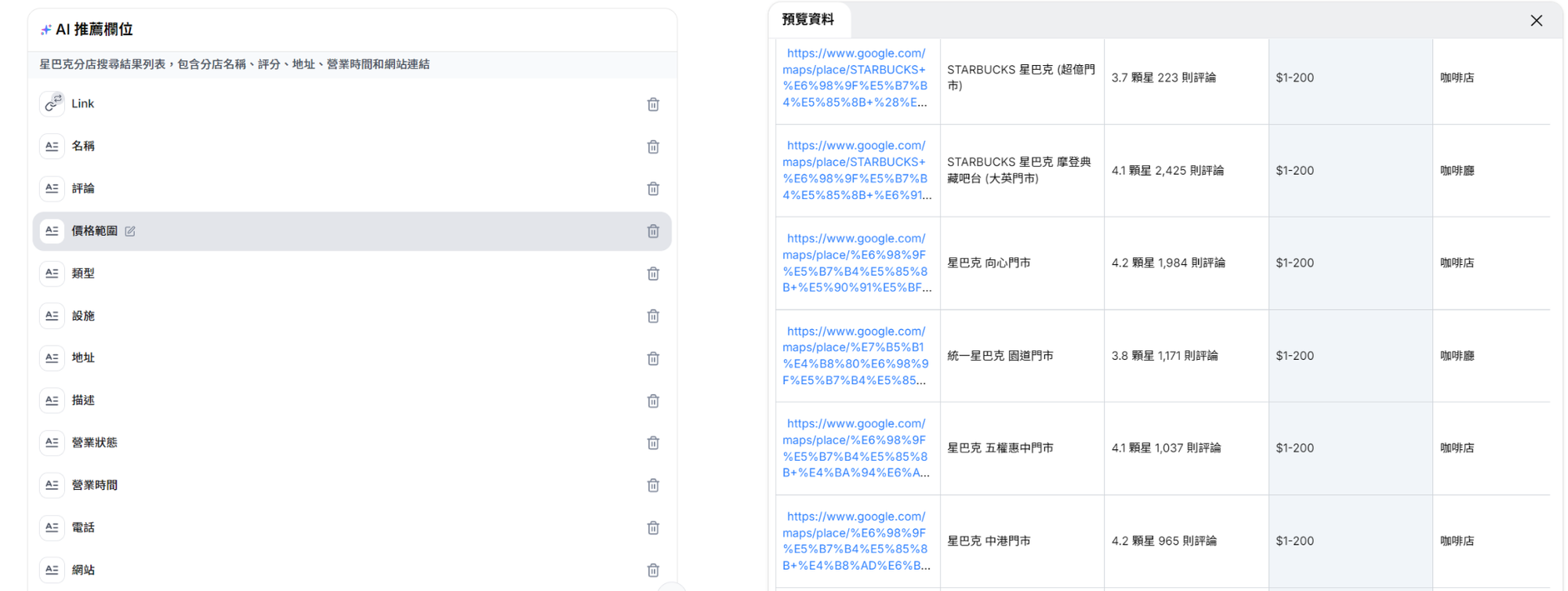 以星巴克來說,我可以從 Googlemap 搜尋某區域內的所有星巴克分店,接著讓 Capalyze 自動進入每間分店的 Google Maps,爬取評論與星等資訊,統一輸出成一份「分店聲量總表」。