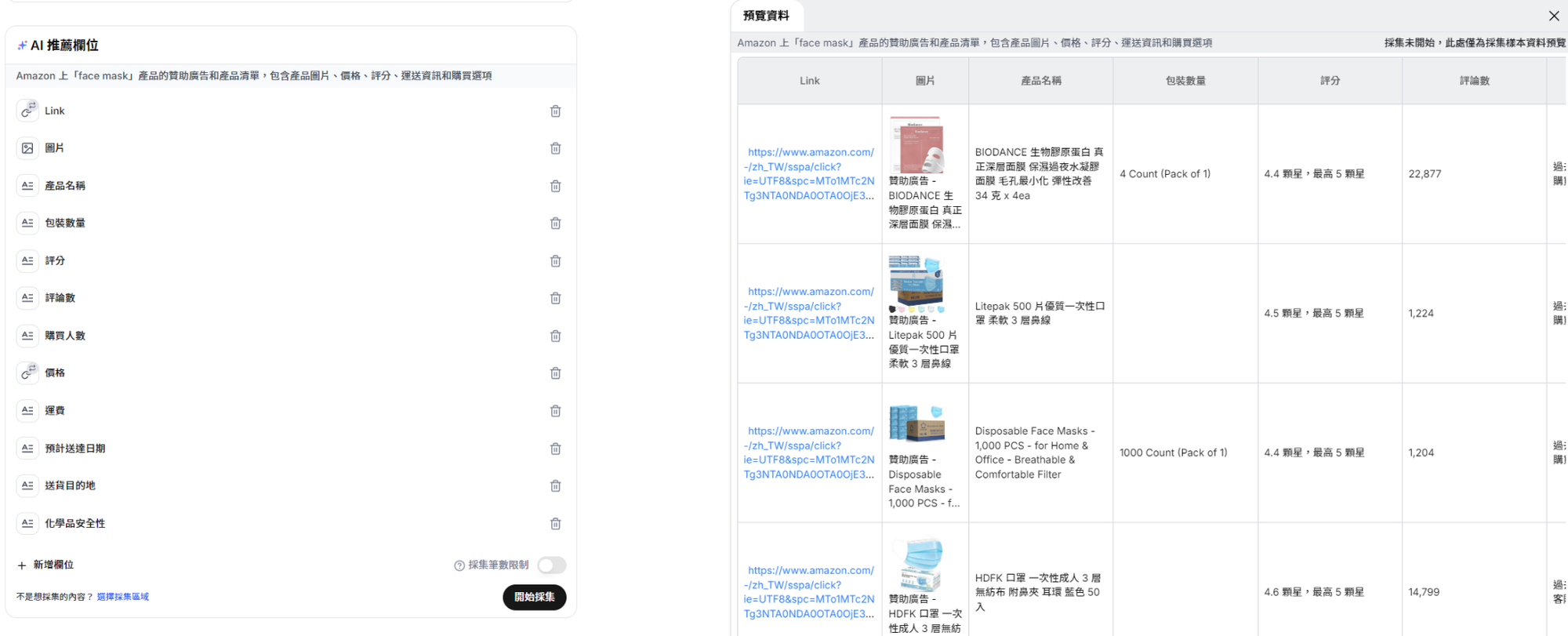 prompt:請幫我採集 Amazon 上「face mask」的產品資訊