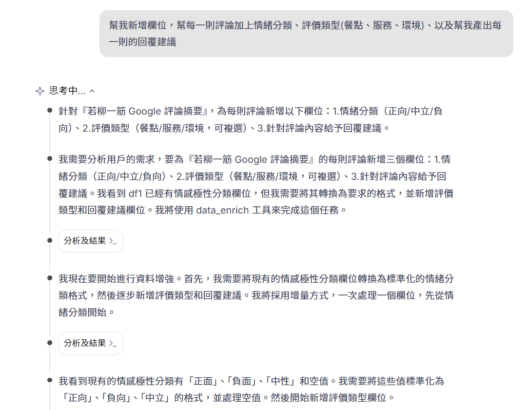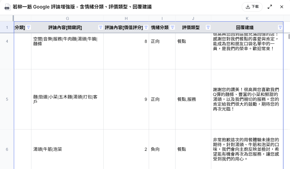 prompt (延續 Google map 爬餐廳評論的對話):幫我新增欄位:每一則評論加上情緒分類、評價類型(餐點、服務、環境)、以及幫我產出每一則的回覆建議