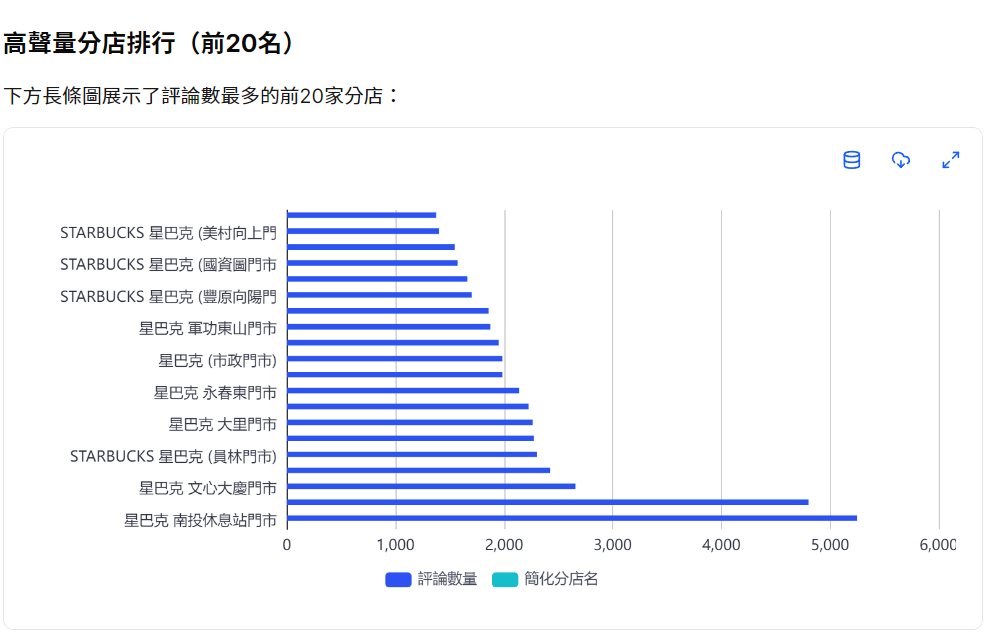 這樣的排行資料不僅可以用來做內部評鑑、門市表現追蹤,還能結合進一步的回覆建議、常見抱怨整理、地區熱度分析等模組,真正把評論轉換成行動指標。