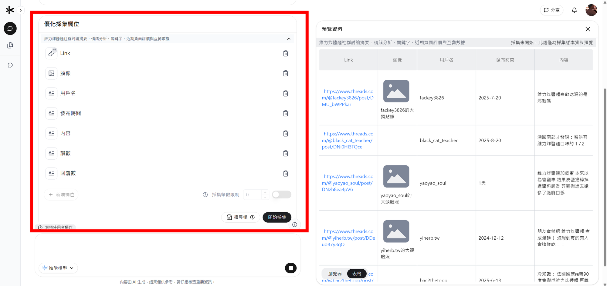 Capalyze 就會藉由他們的瀏覽器擴充外掛,從 Threads 拉下相關留言,幫你做資料採集,接著他們會將這些非結構資料,讓 AI 初步整理出乾淨的欄位表格,包含:留言時間、帳號、內容、情緒標籤、頻率最高的用詞等,接著點開始採集,Capalyze 便會開始大量的去爬取該網頁的所有內容,直到你按下停止。