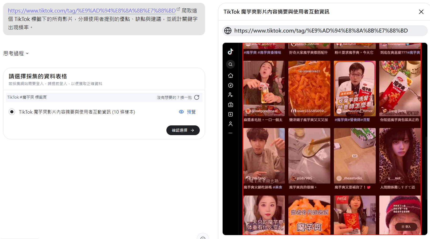 prompt:爬取這個 TikTok 標籤下的所有影片,分類使用者提到的優點、缺點與建議,並統計關鍵字出現頻率。