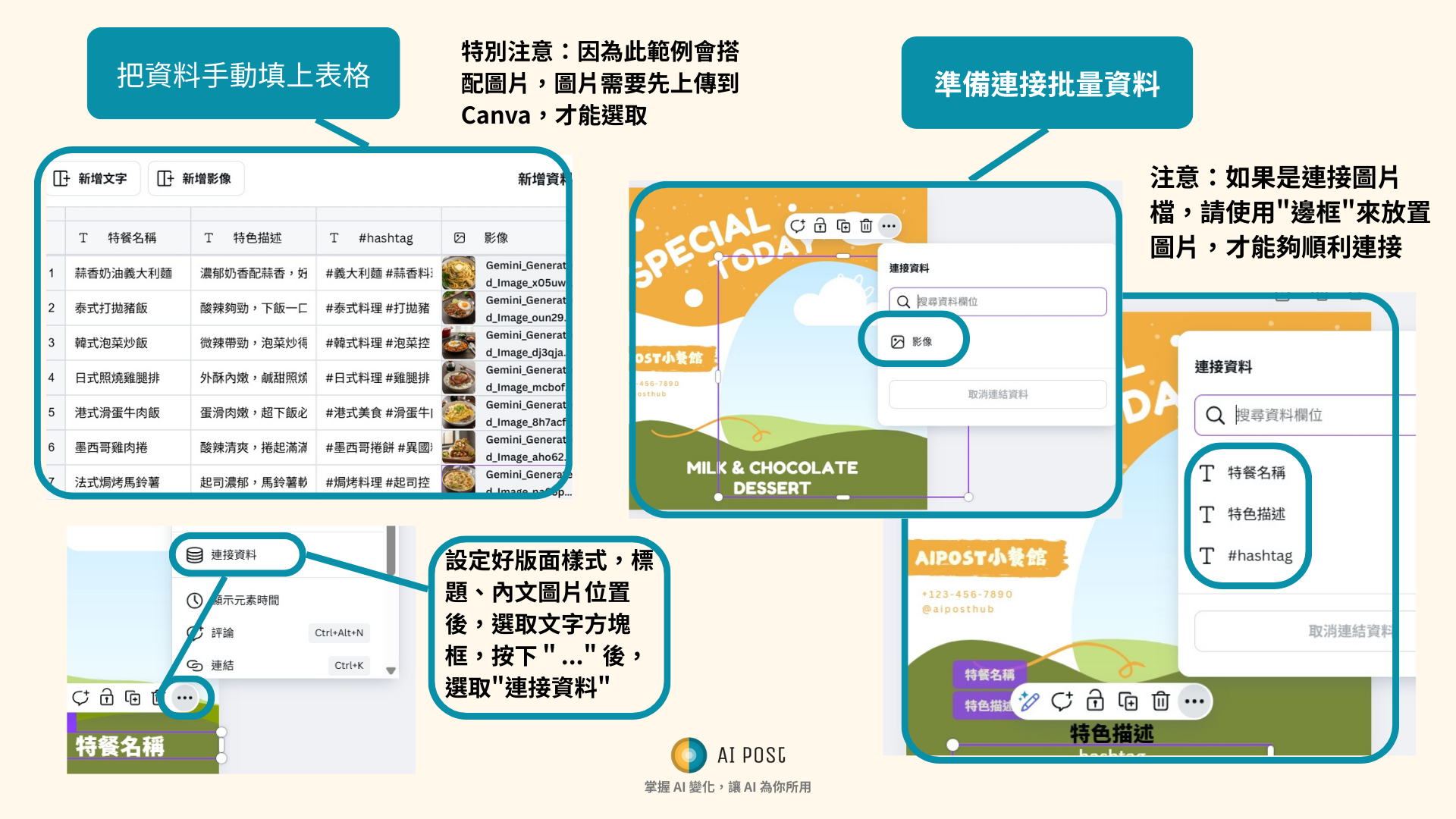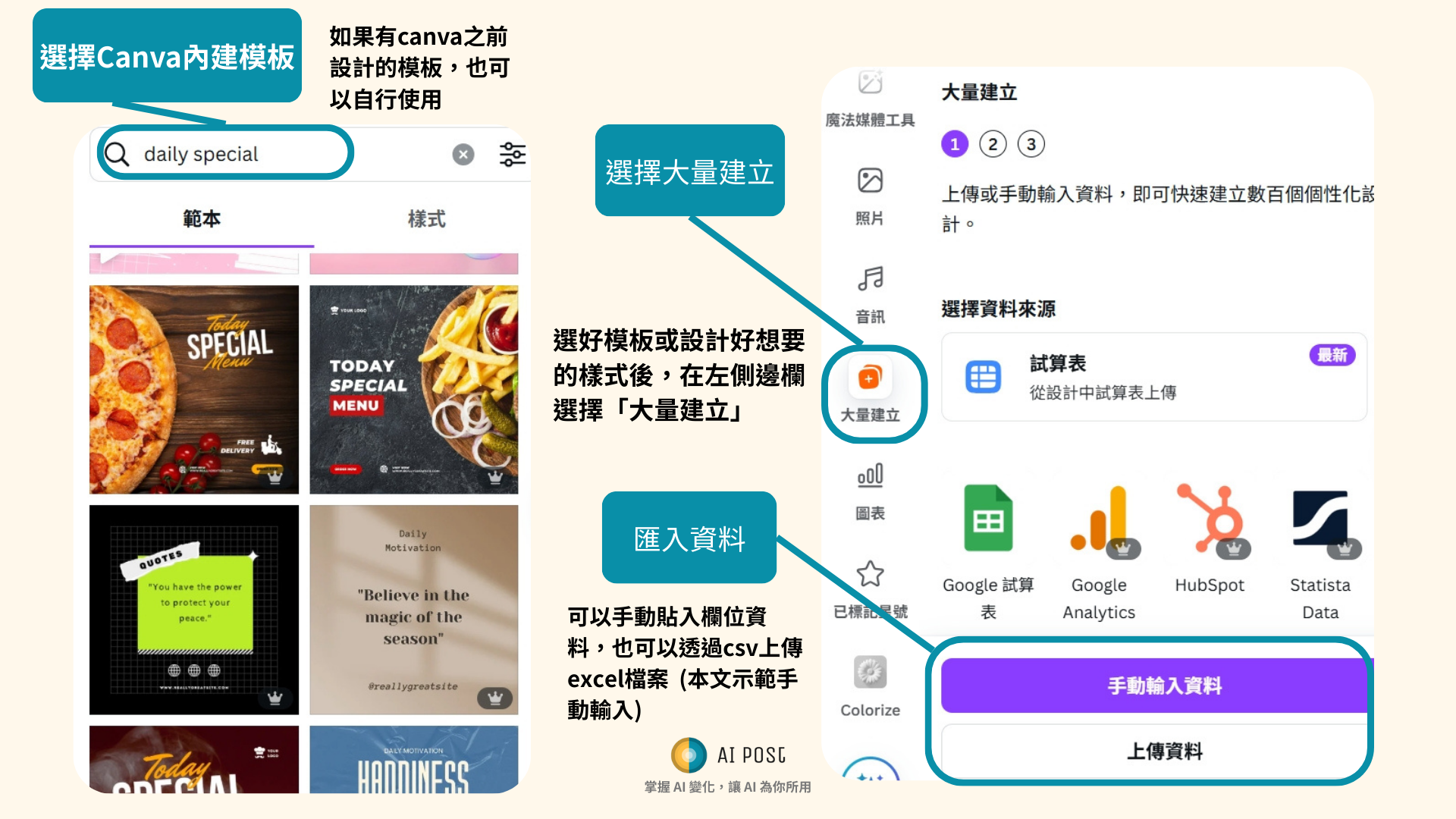- 後端(Canva)幫你批量生圖文 → 一鍵生成設計
