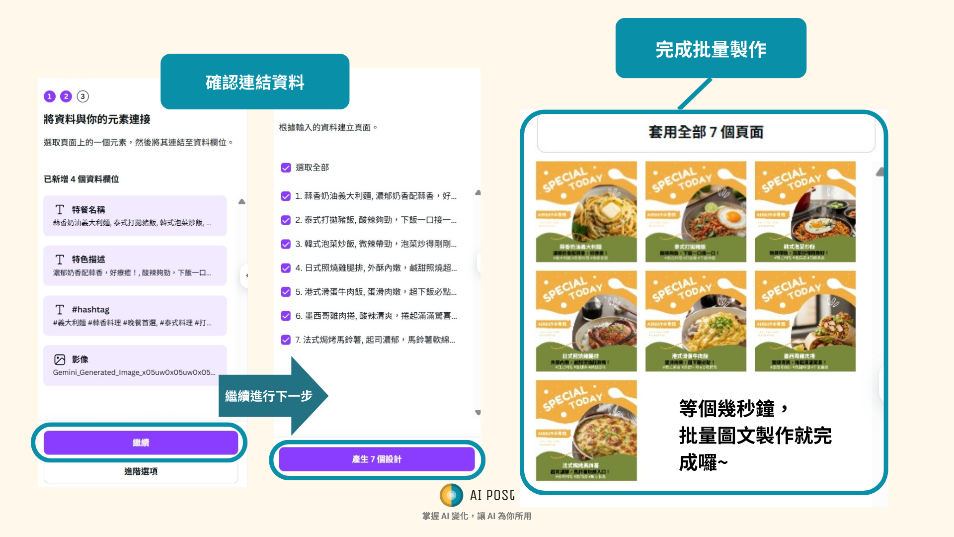 換句話說,你不再需要「先想文案 → 再設計一張 → 再複製改第二張」。現在只要花一次時間設定好規格,之後的貼文就能像流水線一樣,批量完成。