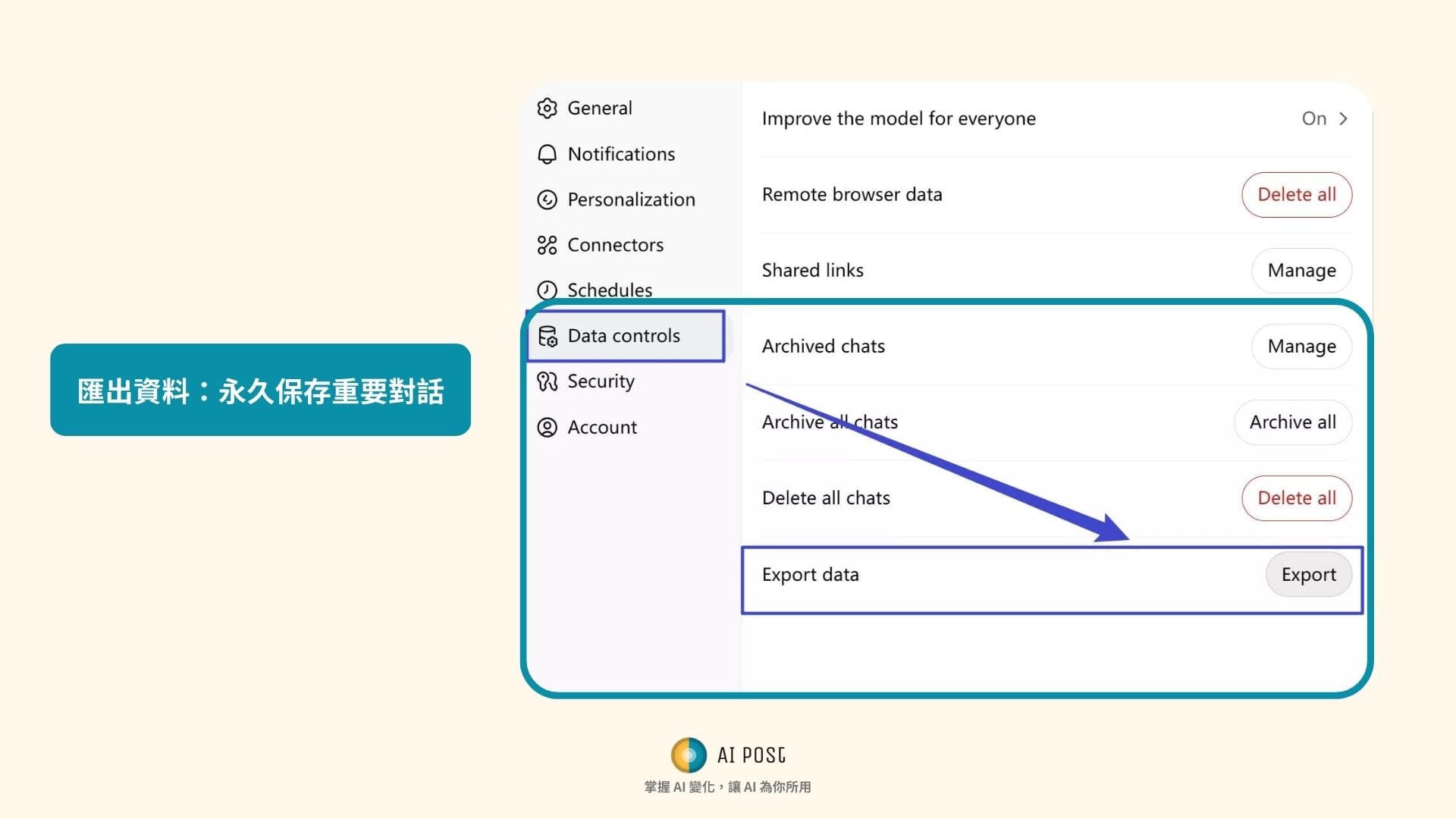 當你累積了很多寶貴的對話內容,就需要進行備份。ChatGPT 提供了完整的資料匯出功能: