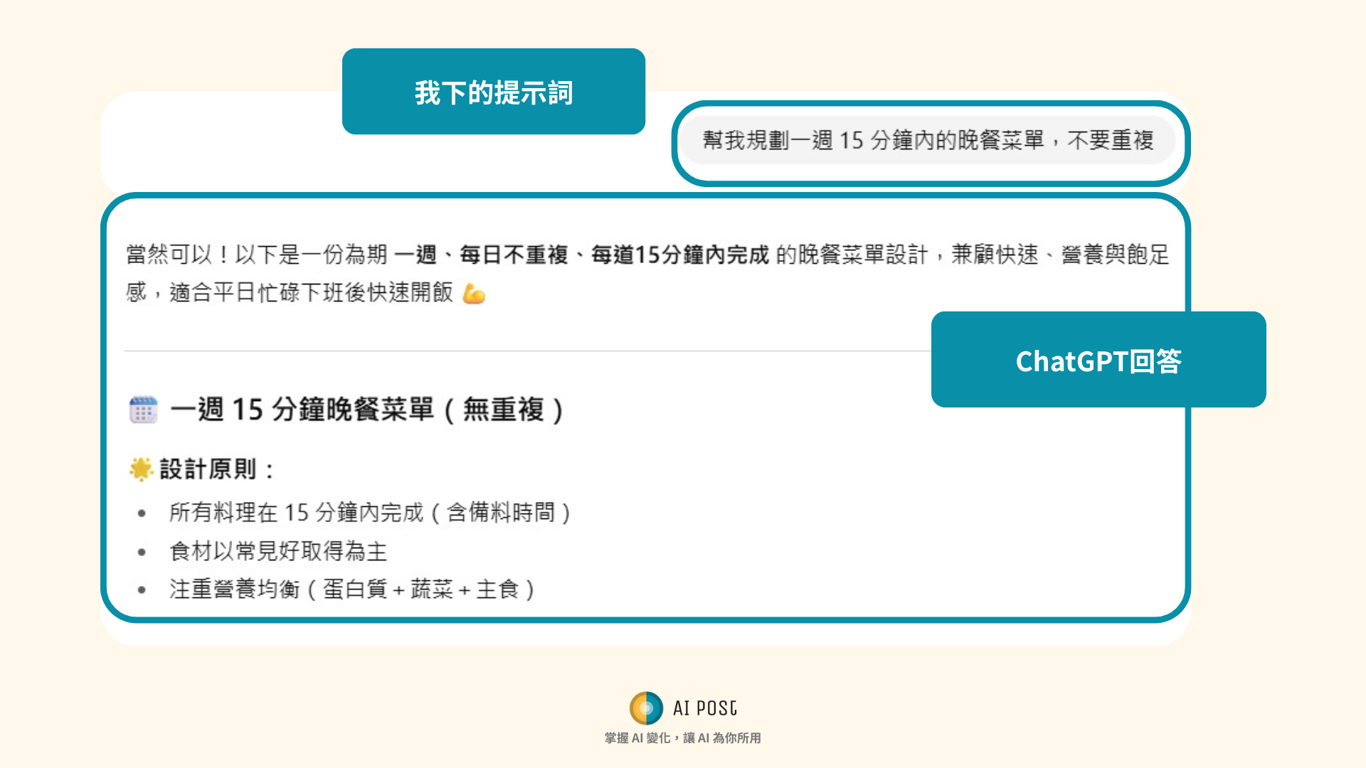 →「幫我規劃一週 15 分鐘內的晚餐菜單,不要重複」