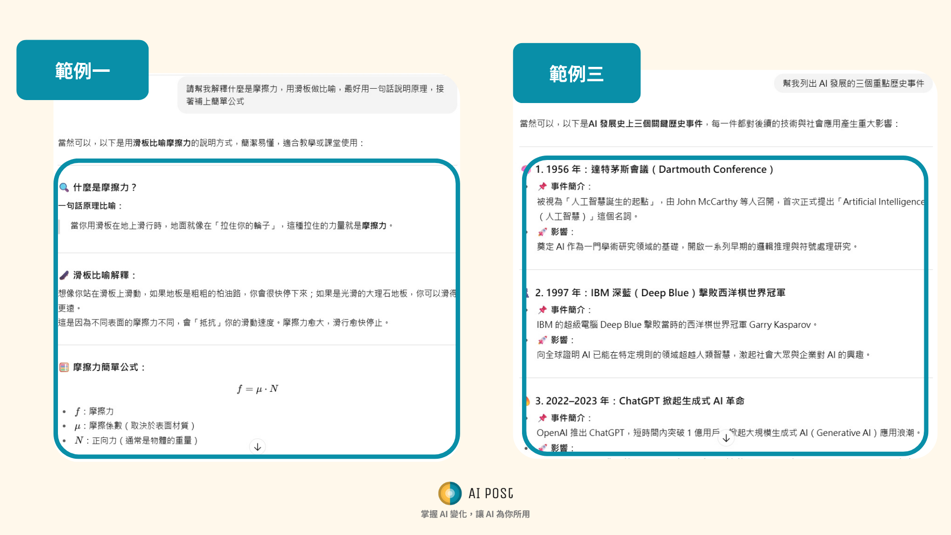 →「幫我列出 AI 發展的三個重點歷史事件」