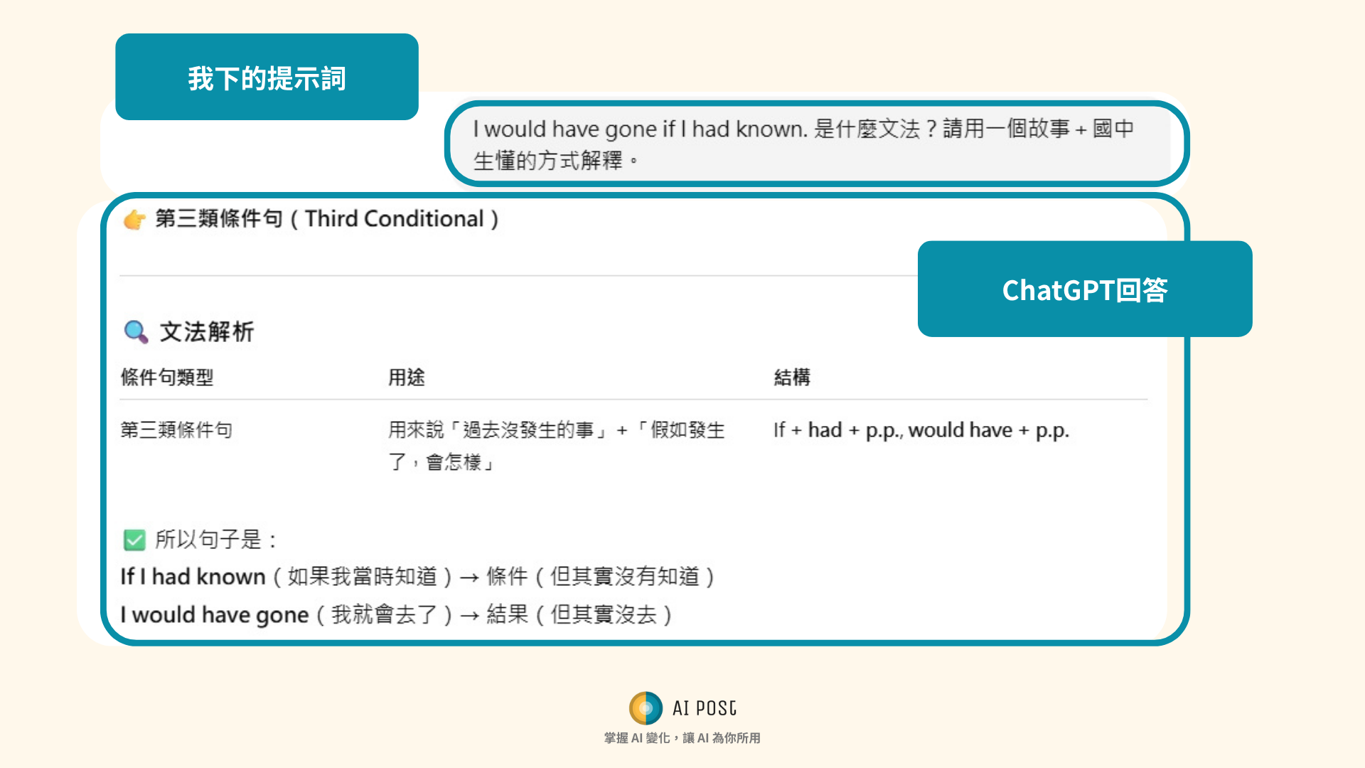 - 語言學習:「I would have gone if I had known. 是什麼文法?請用一個故事+國中生懂的方式解釋。」