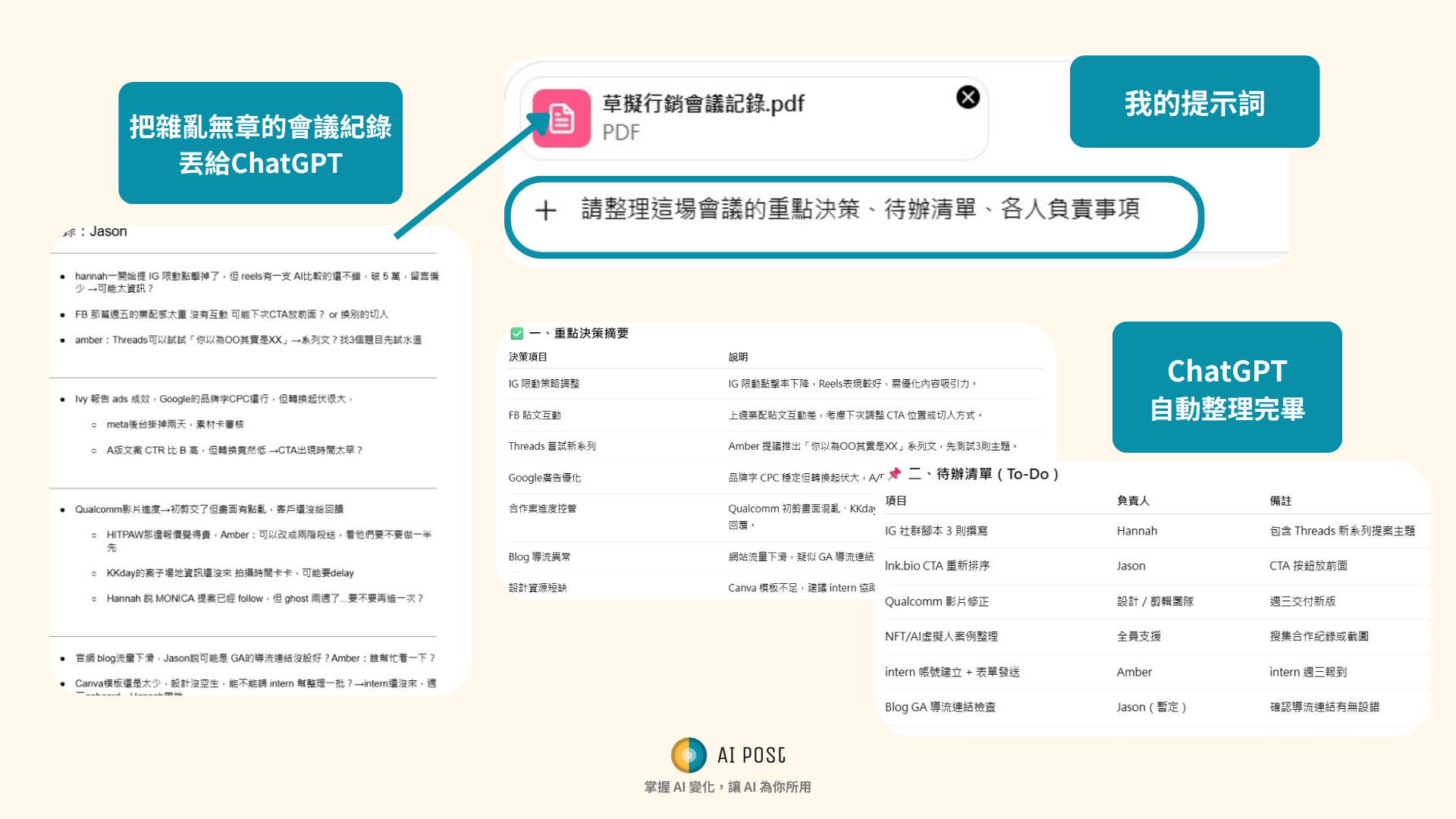 →「請整理這場會議的重點決策、待辦清單、各人負責事項」