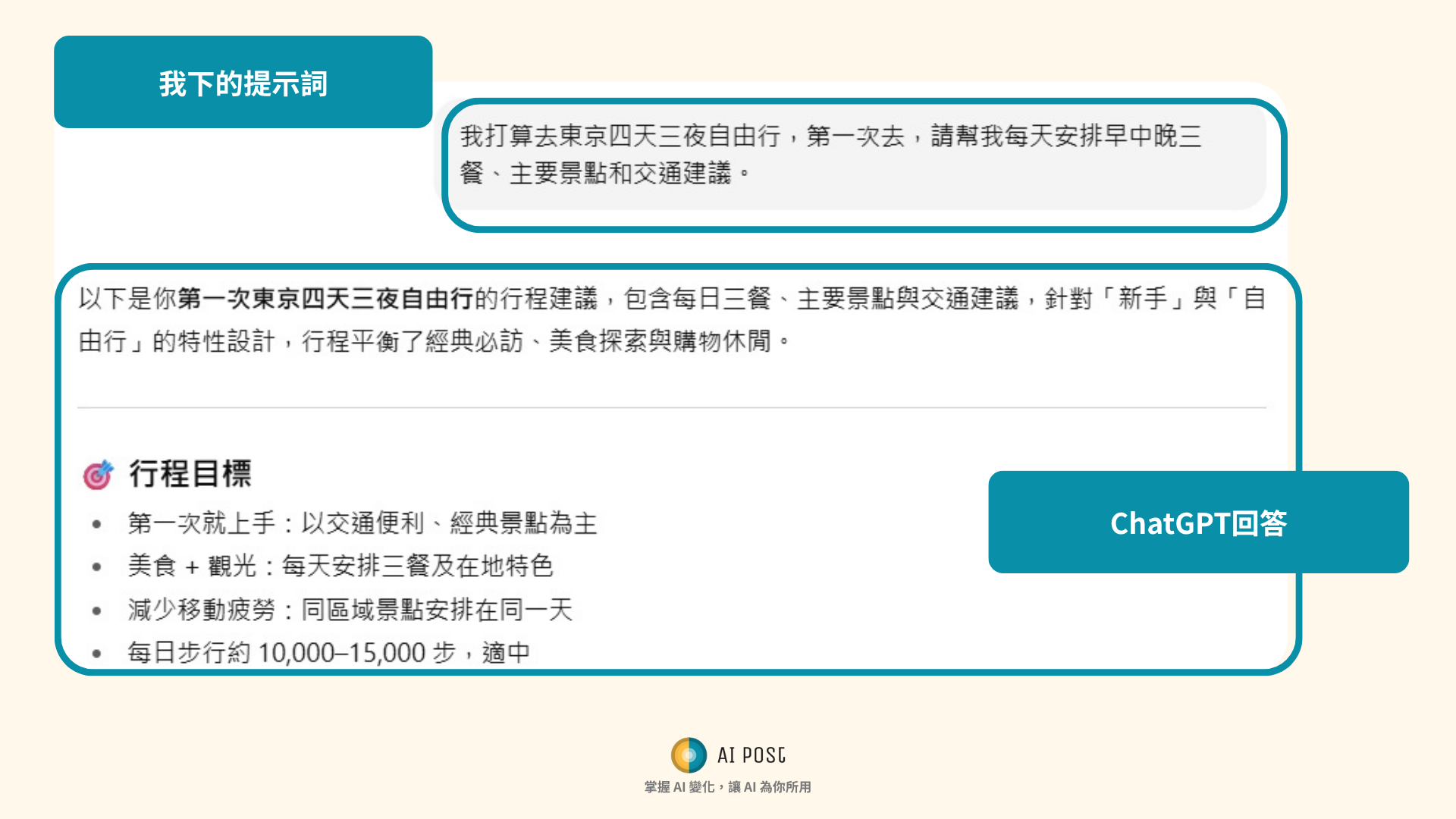 - 出國前:「我打算去東京四天三夜自由行,第一次去,請幫我每天安排早中晚三餐、主要景點和交通建議。」