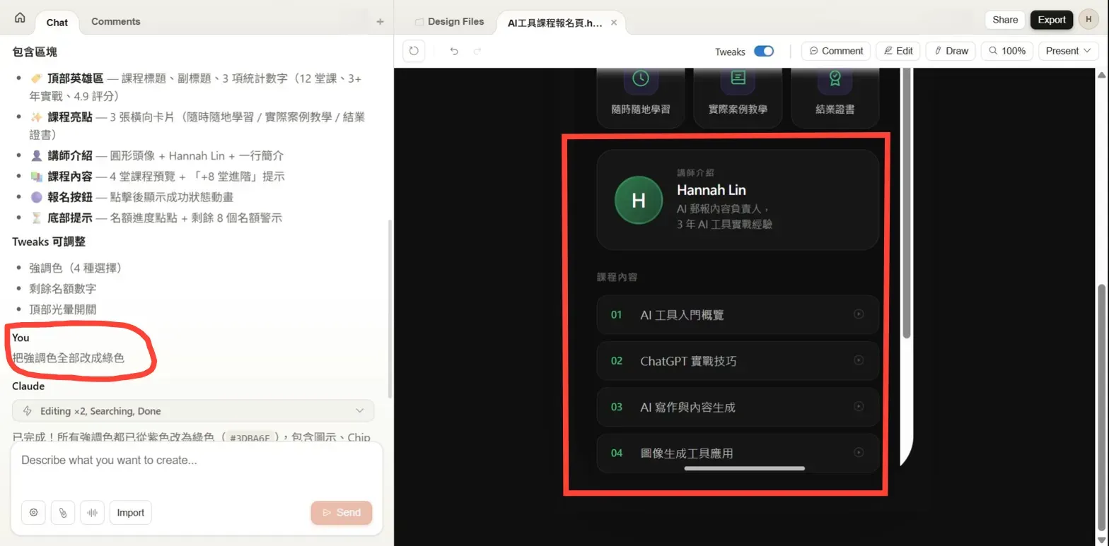 直接在左下角輸入框輸入修改指令,Claude 會根據你的描述更新設計稿。例如輸入「把強調色全部改成綠色」,Claude 會立即把所有對應元素換色,並在左側說明修改了哪些元件。
