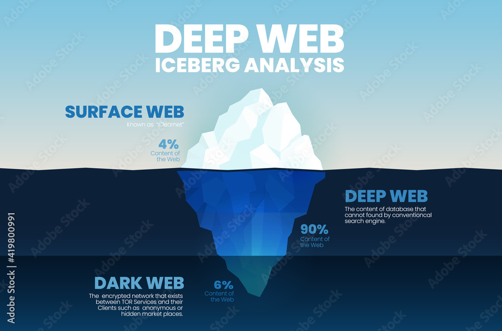 我想很多人都看過「網路冰山」這張圖。上方的 Surface Web 只占整體的 4%,指的是被 Google、Bing 這些搜尋引擎索引的公開網頁;越往下是 Deep Web(需要登入的資料庫、訂閱內容),再往下才是匿名協議的 Dark Web。
