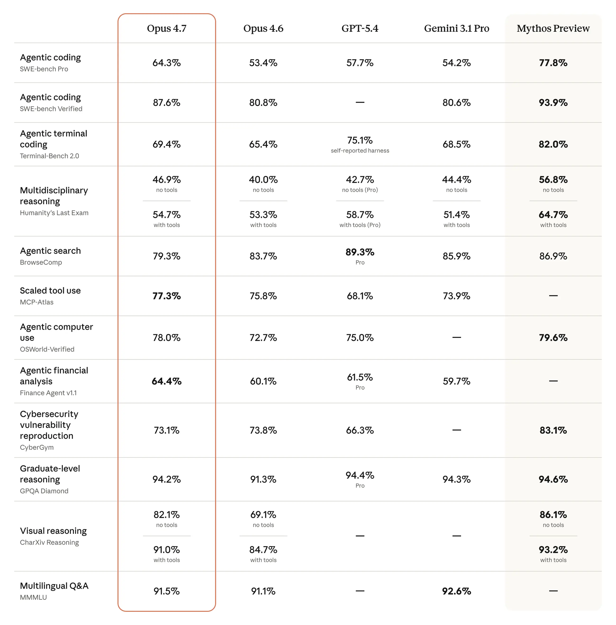 該模型的視覺能力也大幅提升:能夠以更高分辨率識別圖像。在完成專業任務時更具品味和創意,能生成更高質量的界面、幻燈片和文件。儘管它的能力不如我們最強大的模型 Claude Mythos Preview——但它在一系列基準測試中的表現優於 Opus 4.6: