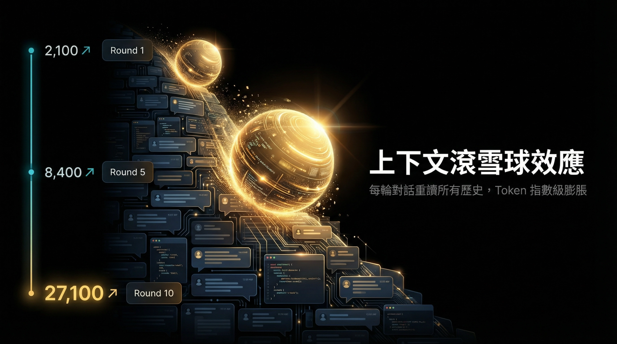 - 上下文滾雪球效應:Claude 每一輪對話都會重新讀取所有歷史紀錄——第 1 輪只需 2,100 tokens,到第 10 輪就可能高達 27,100 tokens,成本是指數級成長。