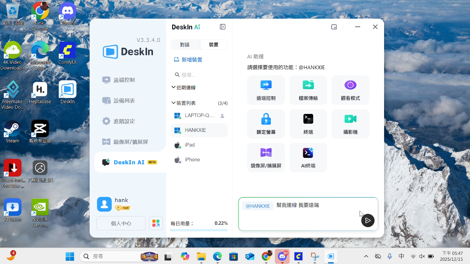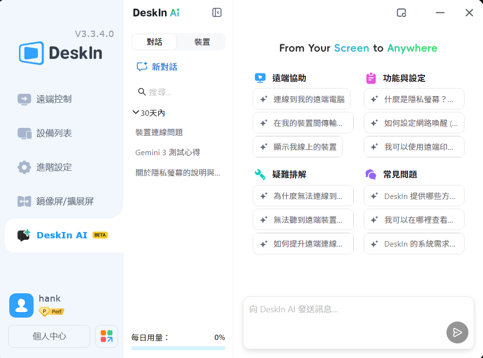 除了性能上的強悍,DeskIn 最近最讓我驚喜的更新就是上線了 AI 助手。這不只是個聊天機器人,它更像是你遠端電腦的「大管家」。