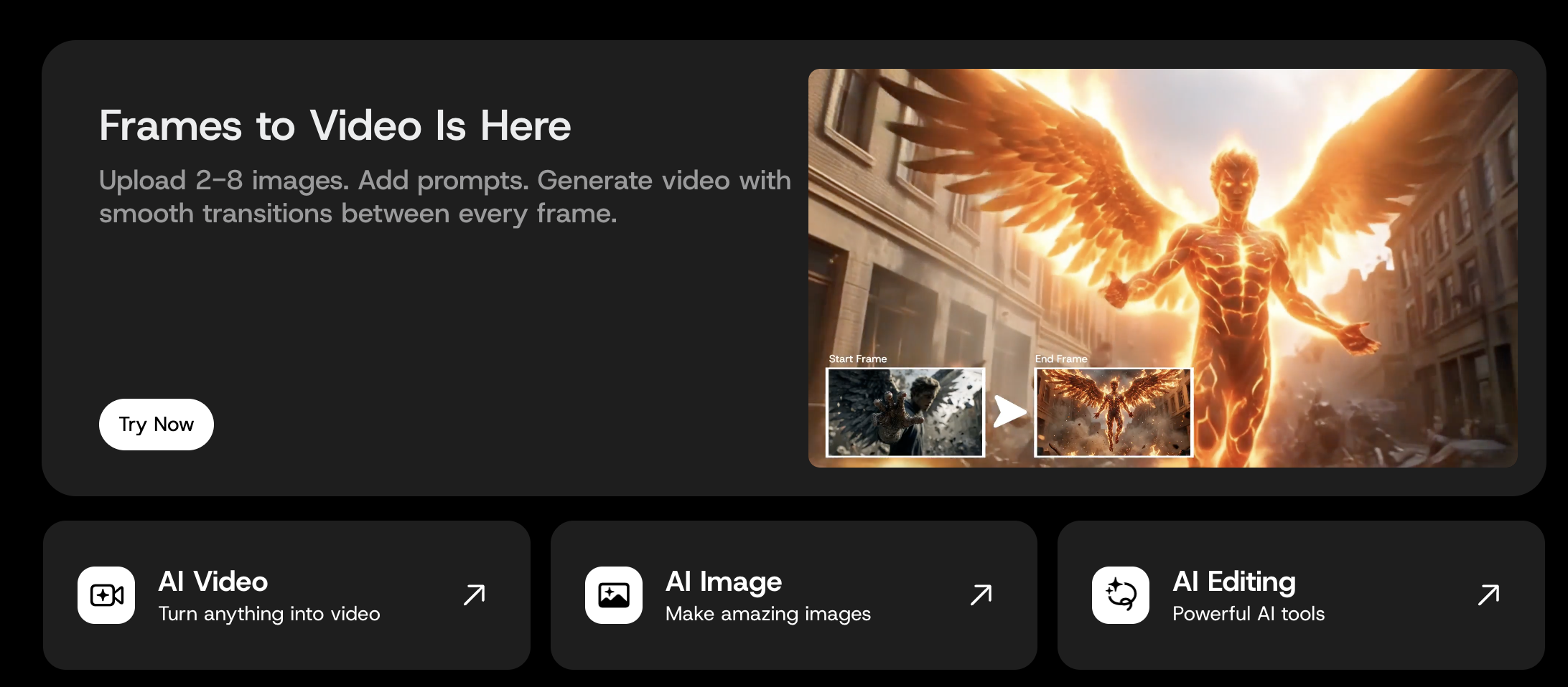 整個平台主要分成三大模組:AI Video、AI Image、AI Editing。這樣的設計讓創作流程非常直覺,新手也能快速理解每個工具在做什麼。