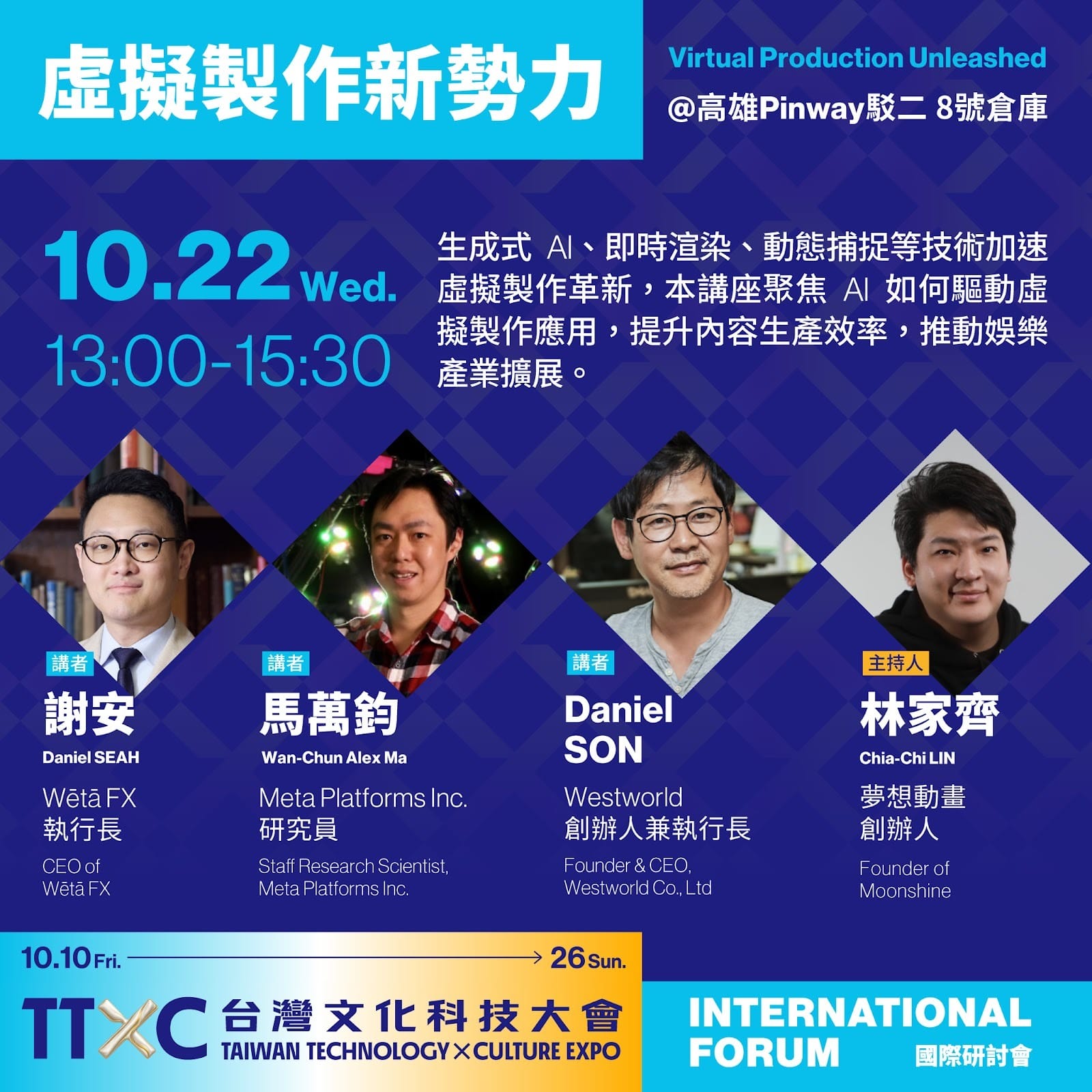 如果你對影視、動畫或沉浸式內容的未來有興趣,這一場「虛擬製作新勢力」的組合幾乎是夢幻等級。這不只是一場講座,而是一場由四個產業關鍵角色共同展開的時代對話。