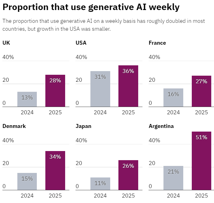 根據牛津大學路透新聞研究所(Reuters Institute)最新發布的《Generative AI and the News Report 2025》,AI 工具在六個國家的使用情況已大幅攀升,尤其在搜尋資訊、回答問題等任務上尤為顯著。報告指出,每週使用 AI 工具的人口比例幾乎翻倍,但針對 AI 在新聞產製的應用,大眾的信任度不升反降,新聞業反而成了最敏感的使用場域。