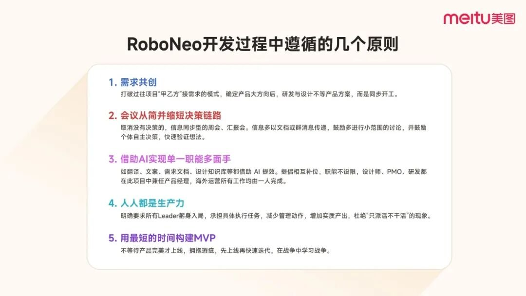 他稱這種現象叫「慣性工作流」——聽起來是流程化,其實是把動能都消耗在這些無意義的瑣事上。於是他們在今年的五月執行了一個名為「RoboNeo」的組織實驗專案,5 月封閉開發,6 月開放內測,7 月正式上線,沒有預算、沒有 PR、也沒有任何外部導流,結果上線首月就突破 百萬 MAU,直接登上多國 Appstore 前十。