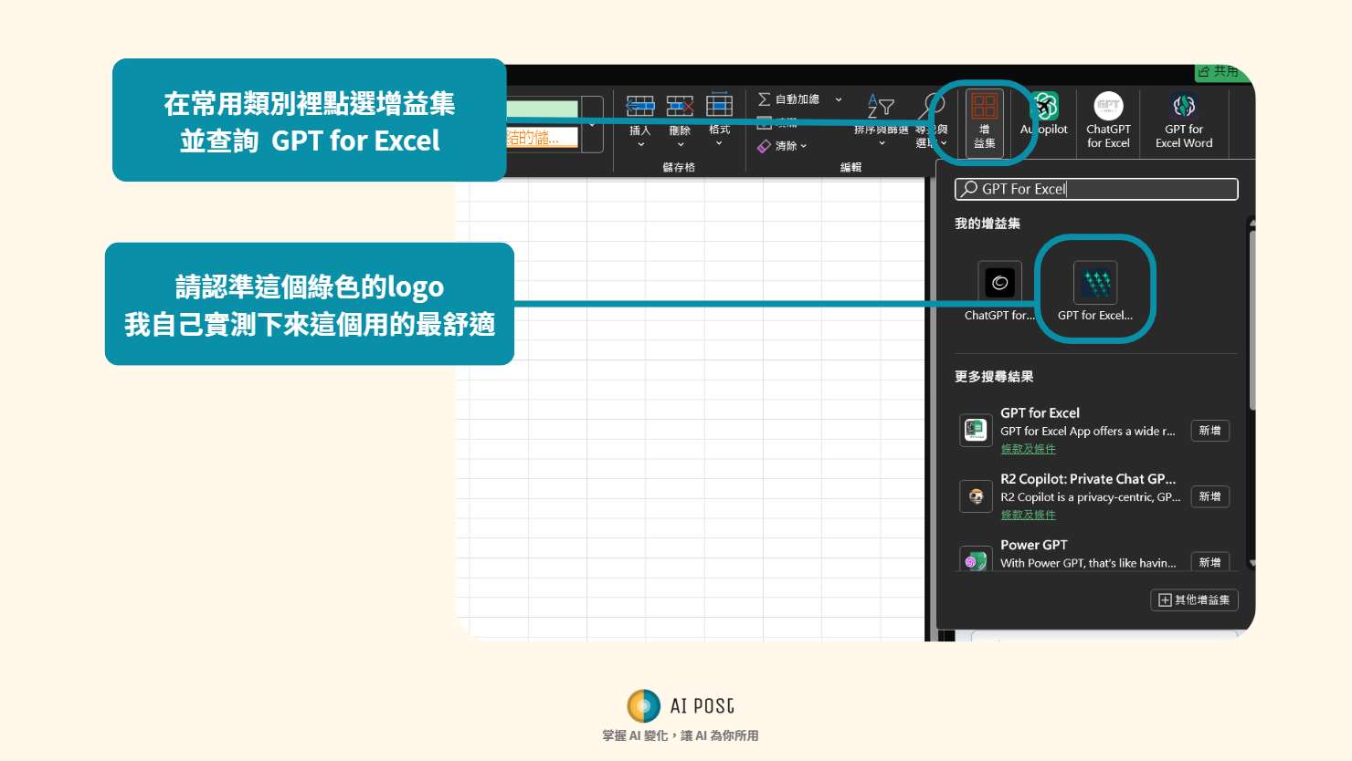 常用 → 增益集 → +其他增益集,搜尋「GPT For Excel」並新增。