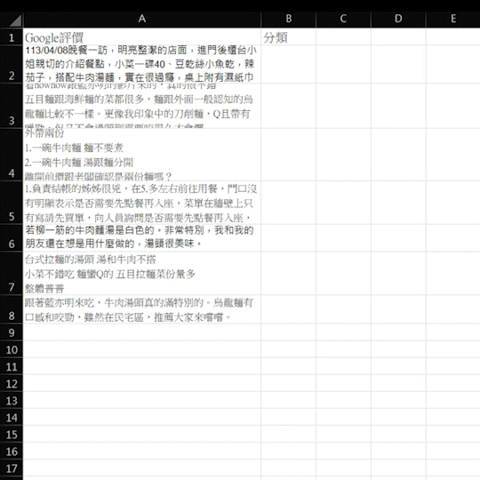 =GPT_CLASSIFY(儲存格, "標籤1, 標籤2, 標籤3") - 應用技巧: