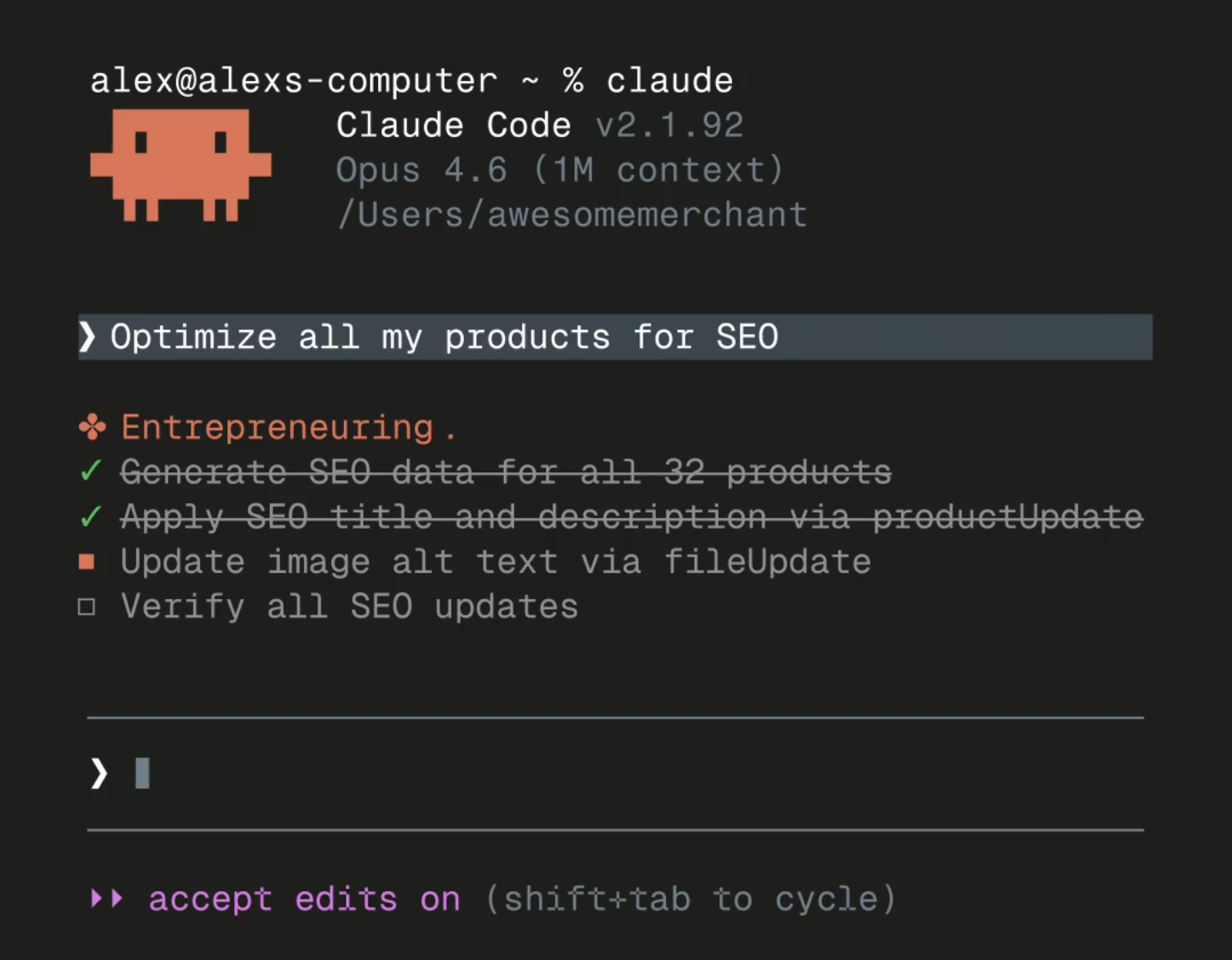 影片裡有個商家只說了一句「幫我優化所有商品的 SEO」,Claude 自動更新了 32 條商品,重寫圖片描述、設定 metadata,還逐一核對所有改動。
