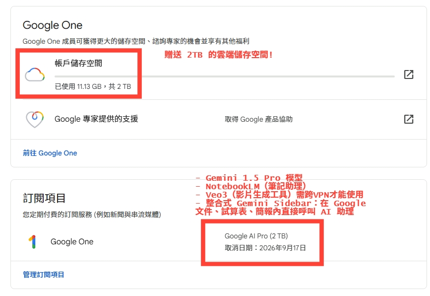 這次學生專案其實就是 Google One 的 AI Premium 方案 + 2TB 儲存空間,價值約台幣 9000 元,以下是最實用的四個功能: