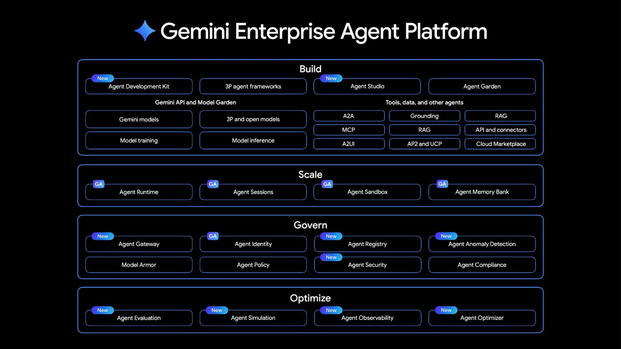 SiliconAngle 的報導指出,新平台整合了 Vertex AI 的模型選取與微調功能,並加入 Agent Studio(視覺化流程建置器)、Agent-to-Agent Orchestration(跨 Agent 協作)、Agent Registry(Agent 目錄管理)、Agent Identity(身份驗證)、Agent Observability(即時監控)等新模組。技術團隊從建模到上線,全部在一個平台內完成。