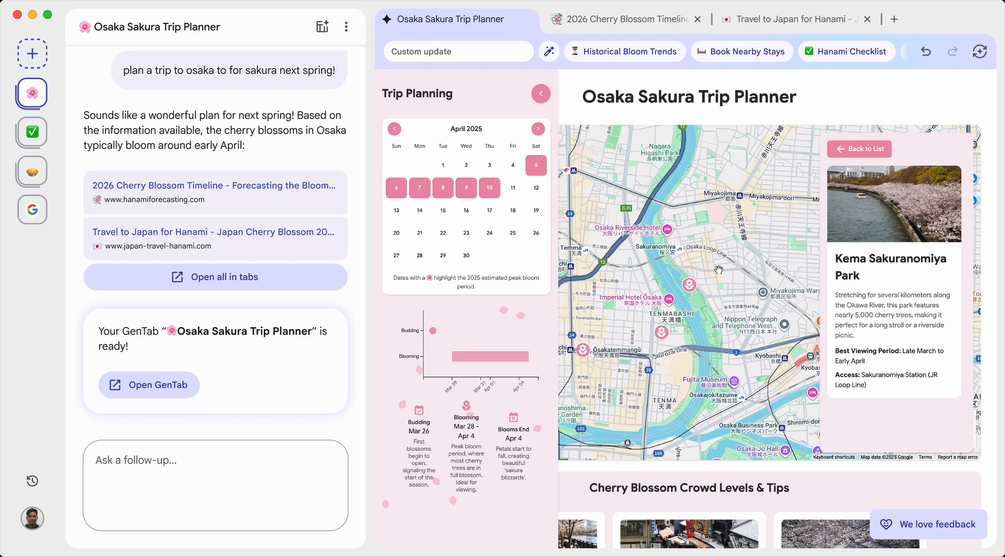 GenTabs 就可能生成一個「京都旅行規劃 app」,把路線、景點、住宿、天氣、預算等資訊放到同一個可互動介面裡,讓你不必一直切來切去。