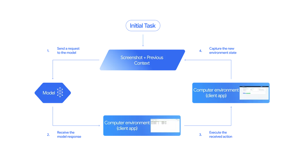 Gemini 2.5 Computer Use採用創新的循環式互動機制,透過四個核心步驟實現精準的介面控制。首先,系統接收使用者請求、當前環境螢幕截圖,以及近期操作歷史記錄。接著,模型分析這些輸入資訊,生成代表特定UI操作的函數呼叫,如點擊或輸入指令。