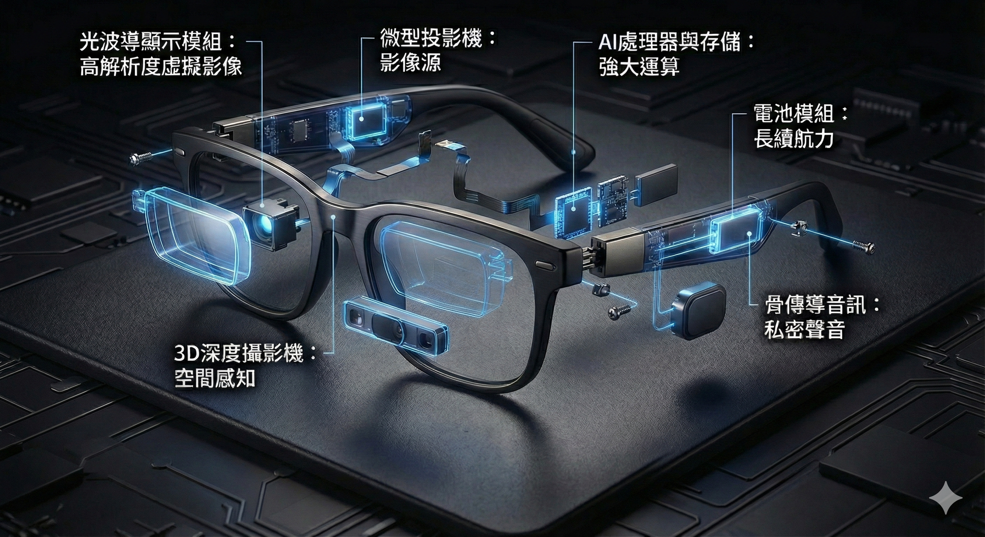 知識準確性:它準確地標註了「光波導顯示模組」、「電池模組」、「AI處理器」等專業中文術語,且文字清晰可辨,沒有任何變形。