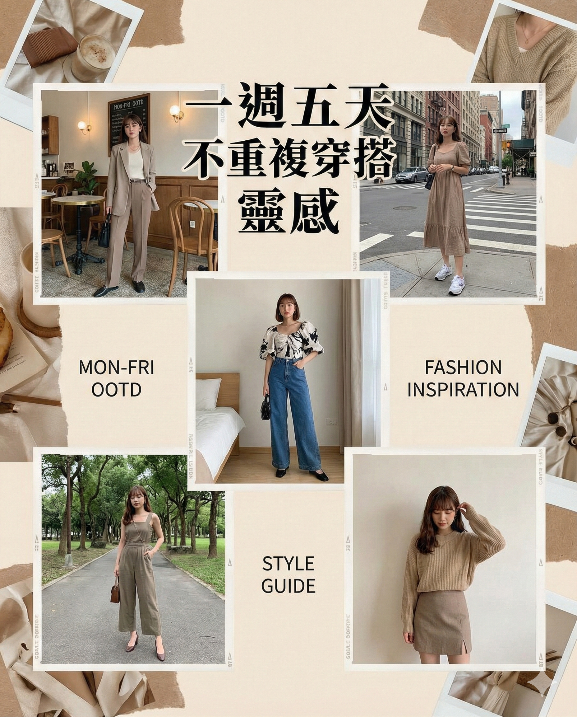 - 通勤 OOTD:生成了 5 套風格統一的職場穿搭插畫,標題「一週五天不重複穿搭靈感」採用了醒目的字體。