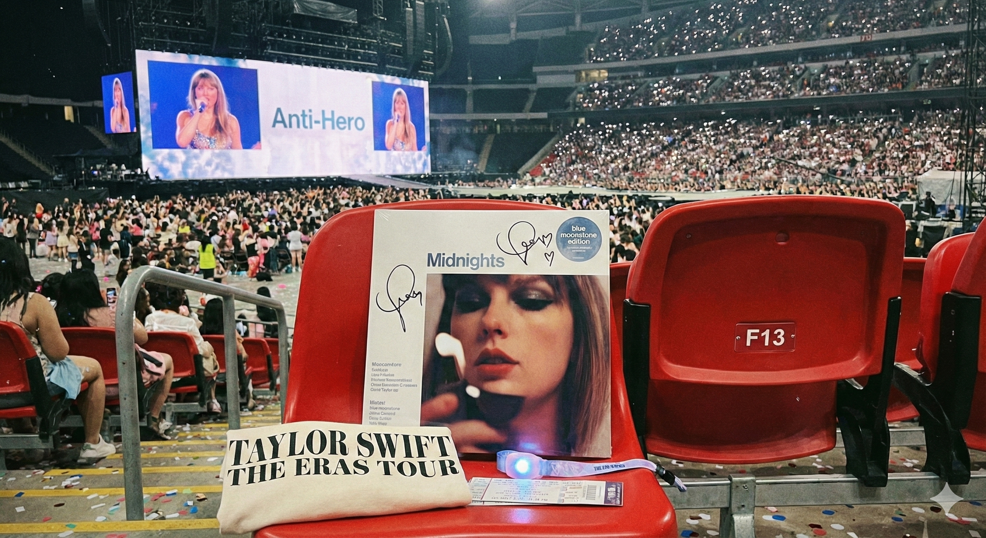 - 場景二:放入「泰勒絲演唱會現場」。這是一個光線極其複雜的場景,但 AI 成功地讓CD 完美融入演唱會現場,透視角度也與周邊也完全契合。產品上的英文字與人像完全沒有變形,這種穩定性令人咋舌。
