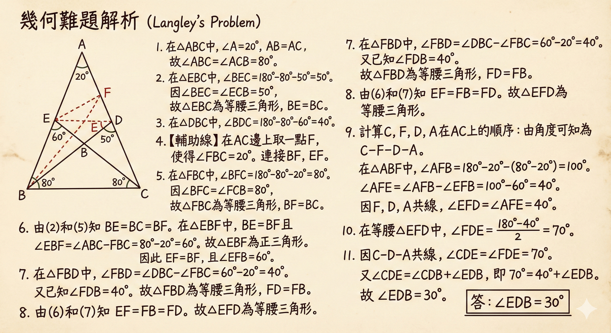 在過去時間裡,我對這款模型進行了極限壓力測試。結果令人不寒而慄——它不再只是一個單純的圖像生成器,而是一個具備了「超級大腦」的跨學科專家。與傳統 AI 僅僅是在模仿像素不同,Nano Banana Pro 展現出了驚人的世界知識推理能力:它能像數學老師一樣寫出幾何題的證明過程,像資深編輯一樣將 90 頁的論文濃縮成一張白板筆記,甚至能像結構工程師一樣繪製出精準的結構圖。