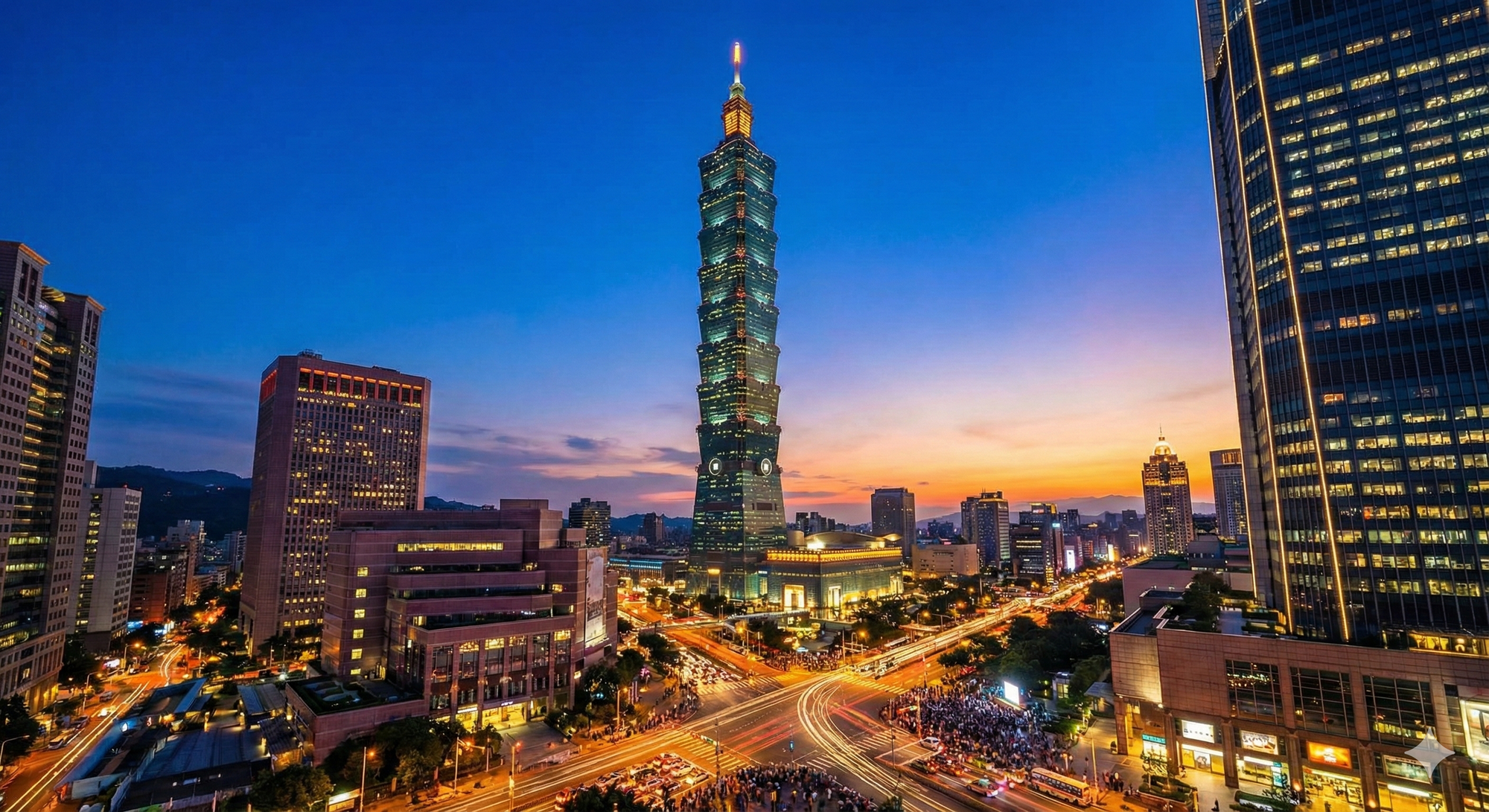 幫我生成座標 25°2′1″N 121°33′52″E,傍晚7:00的風景圖。