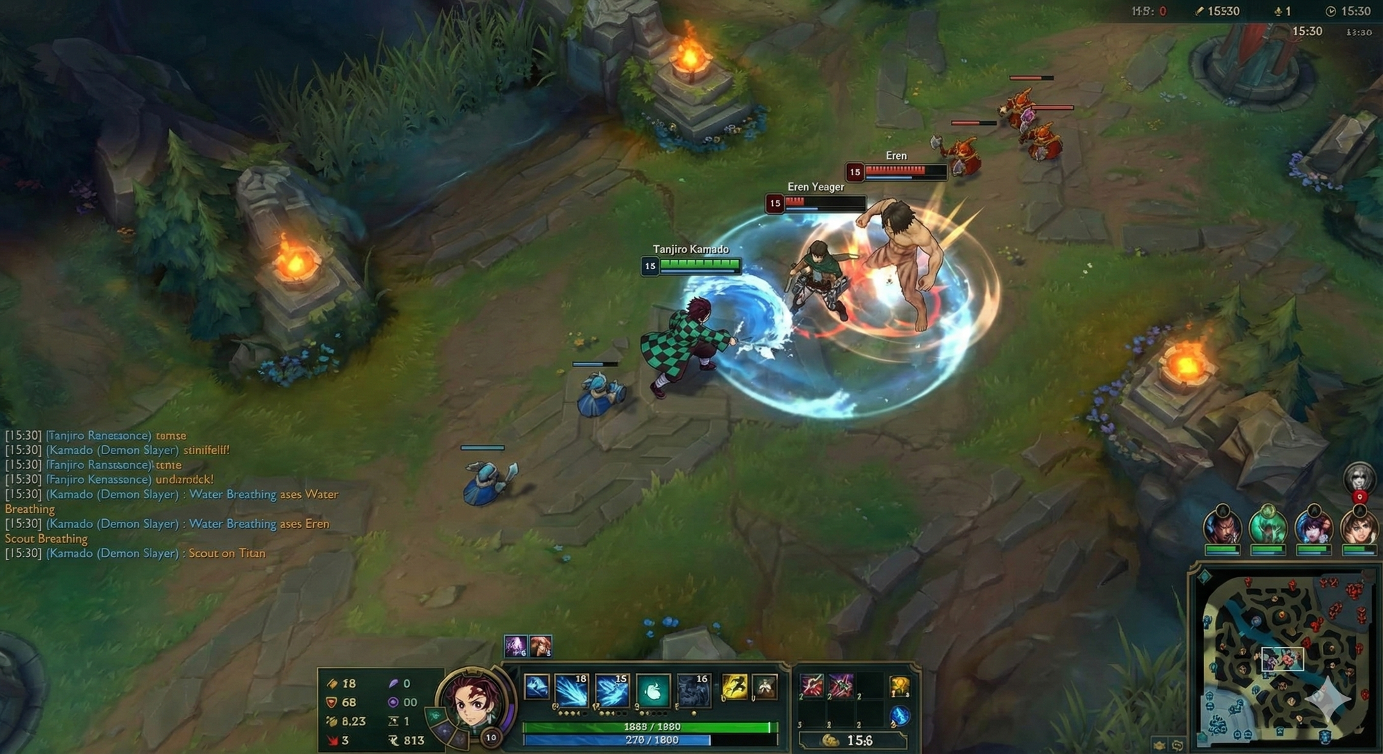 生成一個英雄聯盟的遊戲介面,兩名英雄在中路打,一個是炭治郎,一個是進擊的巨人的艾連。