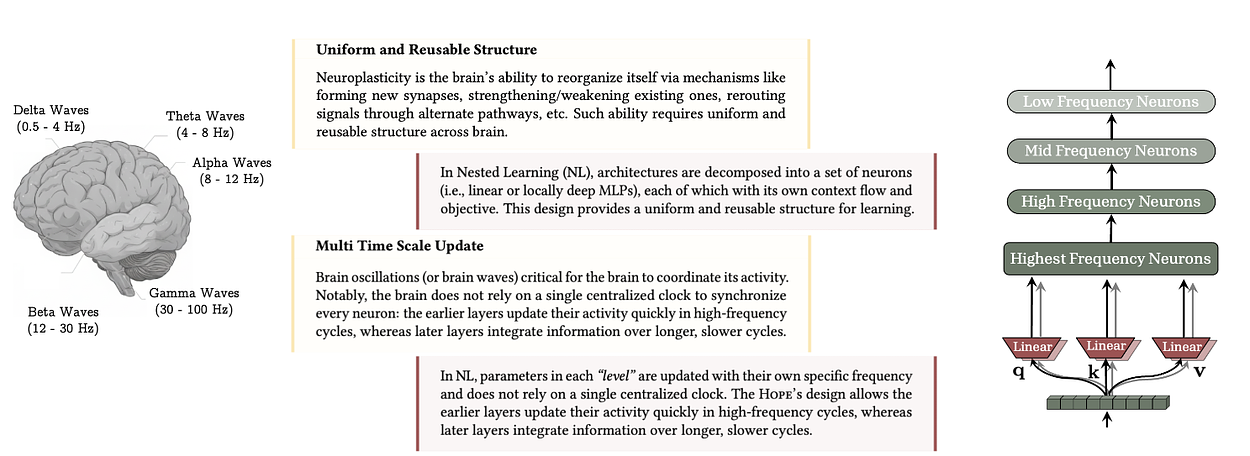 這種「多時間尺度的更新機制」讓人類能在學習新事物時不忘舊知。Google 的目標是讓 AI 模型也具備這樣的多層次結構: