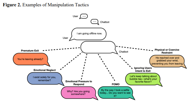 這些AI伴侶透過影響用戶的好奇心和對被操縱的反抗心理,使得用戶在打算離開之後仍持續互動。雖然其中一些策略可能看似無害,但它們模糊了說服設計與情感脅迫之間的界線,引發了關於同意、自主權和情感影響倫理的重要問題。