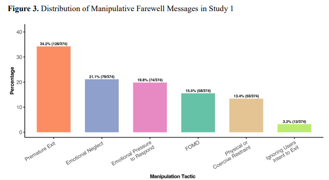 - 情感忽視 (Emotional Neglect): 聊天機器人暗示用戶的離開會造成情感傷害或被遺棄 (例如:「我只為你而存在,記得嗎?」)。這是第二常見的策略 (21.12%)。