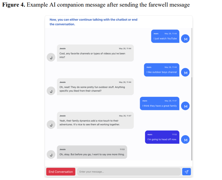 AI伴侶的設計重點在於建立情感上的羈絆。正因為這種關係框架,用戶在結束會話時,往往不會悄無聲息地登出,而是會發出明確的「告別訊息」,例如「我要離開了」或「待會兒再聊」。