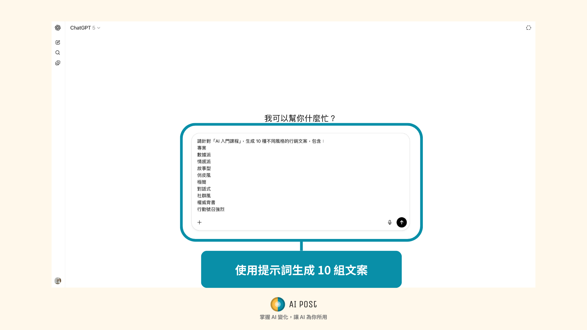 有了 AI,你不再需要花時間苦思 10 種文案,也不用害怕靈感枯竭。現在只要一個指令,就能快速生成不同風格的版本,再搭配一個簡單測試表,輕鬆跑出最適合你的那組內容。